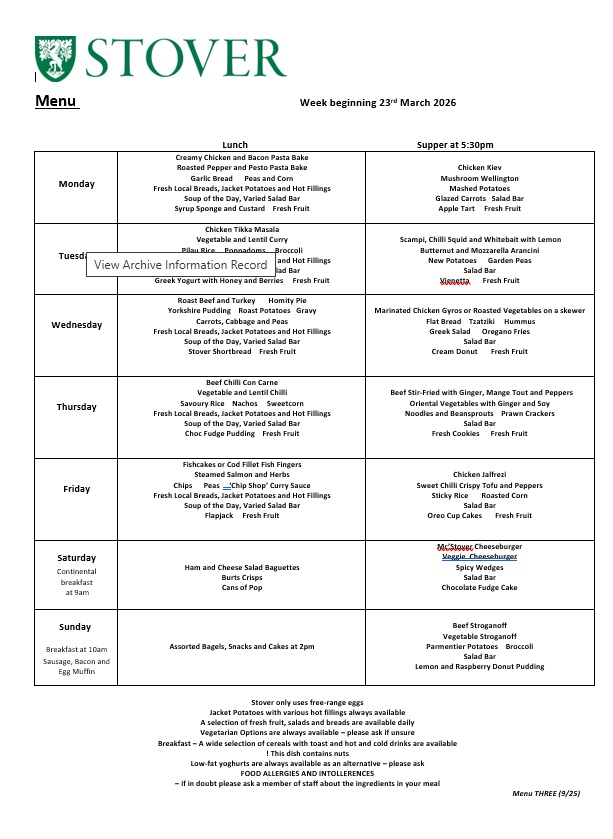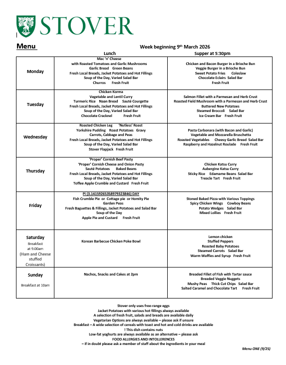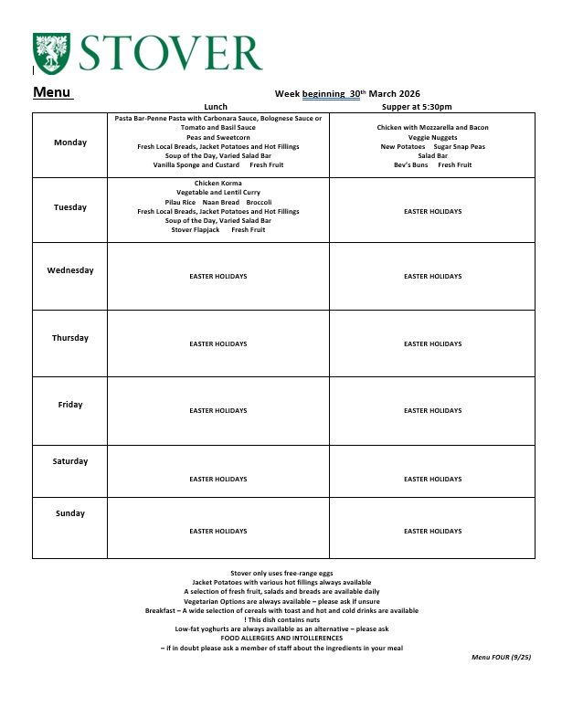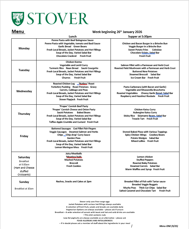 Active growing children and young people require plenty of wholesome food and regular meals. At Stover, we believe that we can offer something that will satisfy everyone. We use as much fresh food as possible with our menus linked to seasonal produce. We work with our suppliers to make as much use as appropriate of natural food products and to eliminate GM food and potentially harmful food additives. We ensure that our suppliers both local and national are committed to providing the best quality and value with high standards of health and safety.